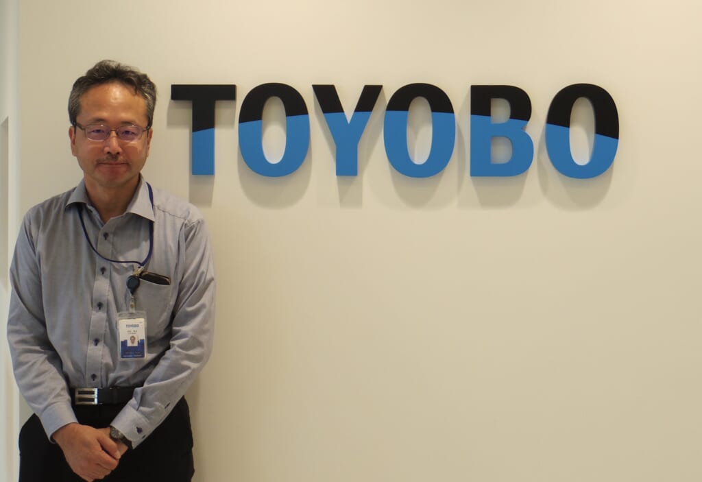 北村氏は、入社以来多くの研究開発に携わってきた。最も印象に残っているのは、「ゼノマックス®」という高耐熱性ポリイミドフィルムの立ち上げだ。東洋紡が有するポリマー合成技術や溶液製膜技術を駆使し、500°Cでも反りや変形が発生しない高耐熱性と、ガラス・シリコンウェハと同等の線膨張係数を示す優れた寸法安定性を両立したフィルムだ。北村氏は、ポリマー重合パイロット技術開発に参画し、事業化を見据えた品質管理・製造・応用開発を一体として行う事業開発プロジェクト、次いで新設工場の立ち上げプロジェクトに携わった。「研究開発を事業としてかたちにする大変さを、身を持って実感しました」。これが、どうやったら今のテーマを事業にできるかを考えるときの基盤になっている。